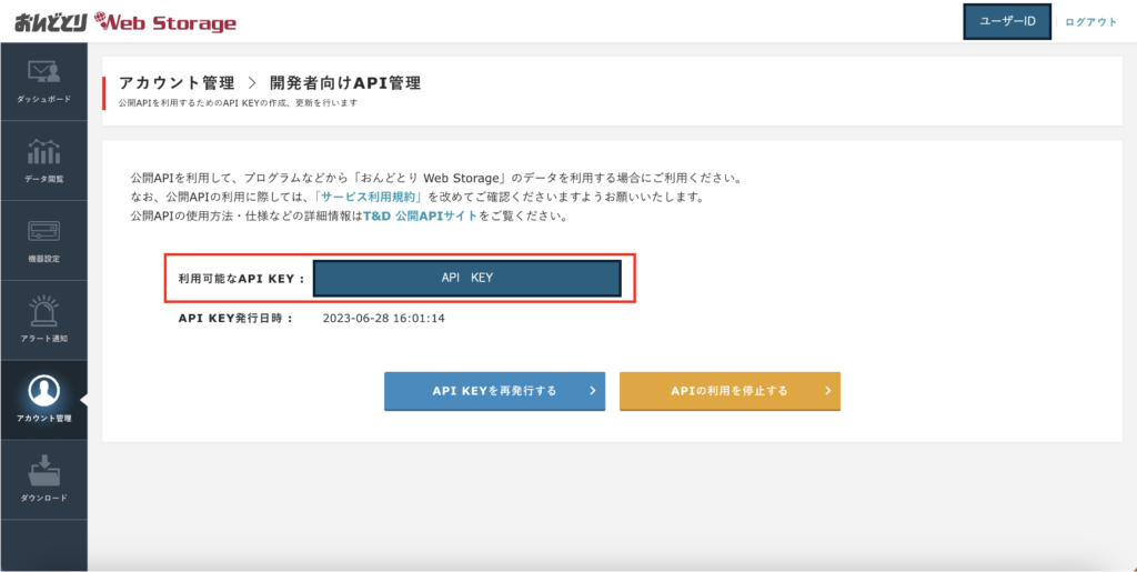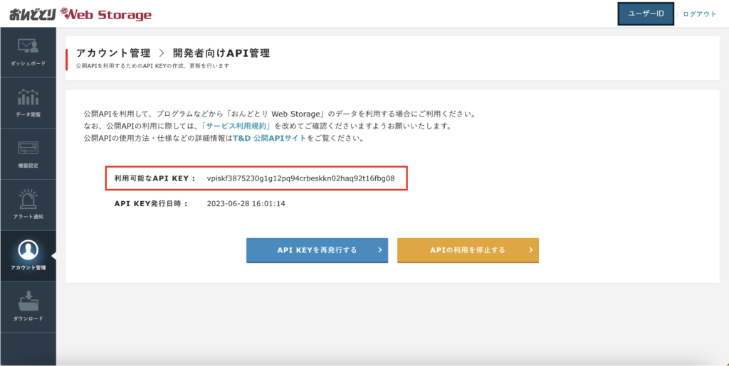 手順4:おんどとりサービスのマイページで「API KEY」を確認する。