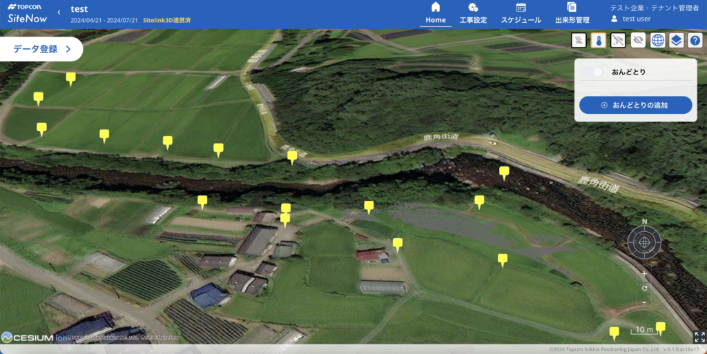 SiteNowの操作画面を開き、おんどとり端末を登録したい工事の「Home」画面に移動します。図の通り、画面右上のアイコンからおんどとりのアイコンを選択します。