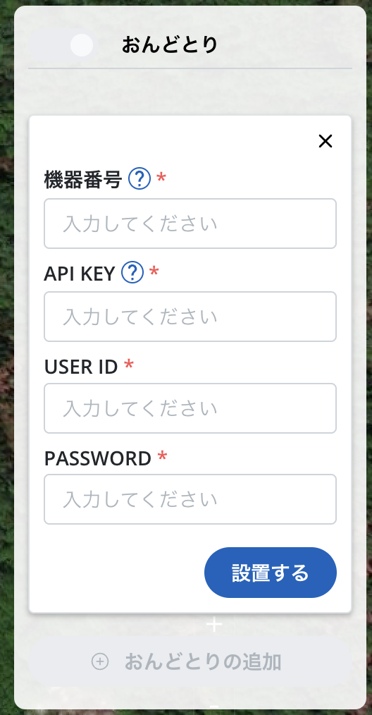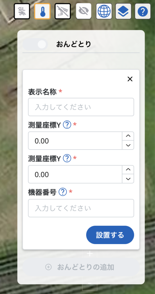 「おんどとりの追加」をクリックすると以下の図の通り登録用のパネルが表示されます。手順2~4で確認した内容を対応する入力欄に入力し、「設置する」をクリックするとおんどとりの登録は完了です。地図上に温度を表示するアイコンが追加されていることを確認します。