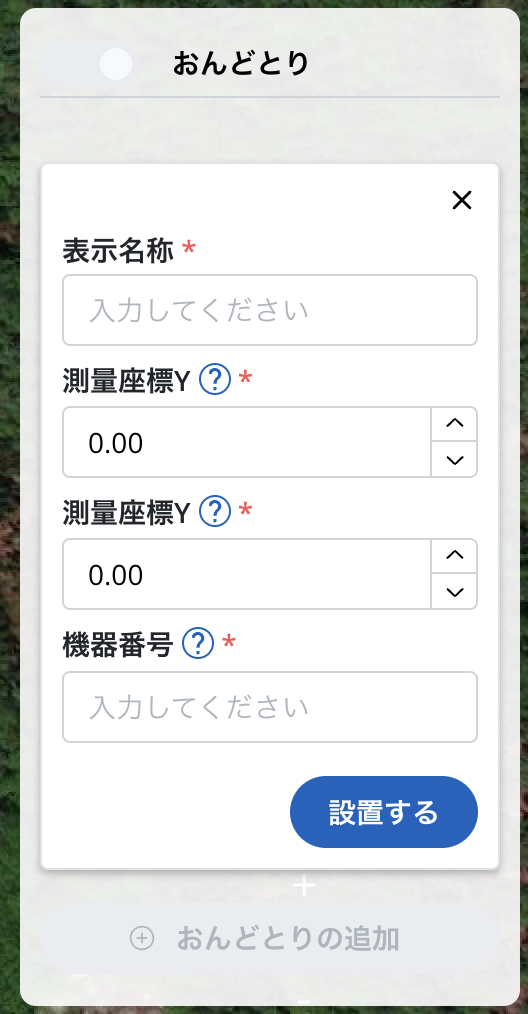 - アイコンの表示場所を補正したい場合は測量座標X/測量座標Yの入力欄の右横にある ∧ / ∨ ボタンを使用してください。