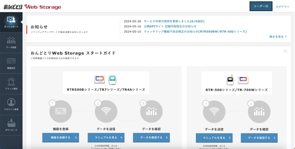 手順2で取得したIDとパスワードを使用して、おんどとりサービスのマイページにログインします。