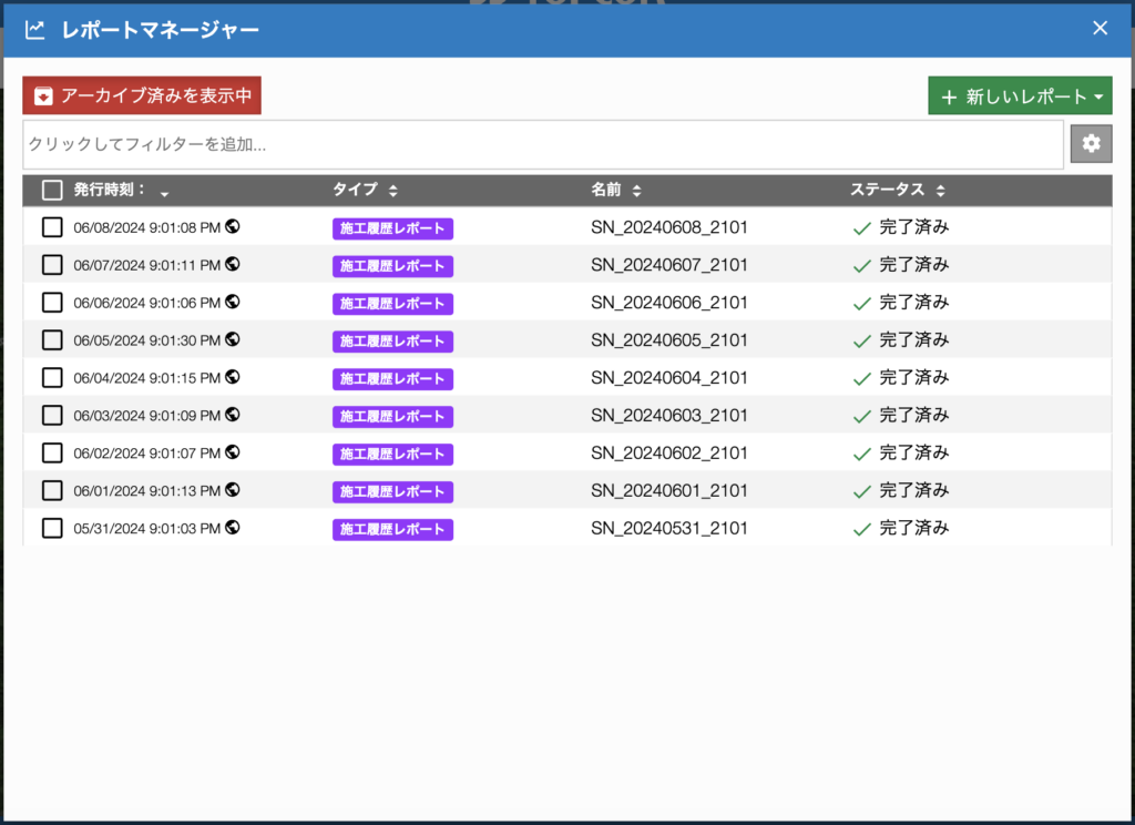 取得後は下図の通り、Home画面の施工タブ内にて先頭(一番上)のデータとして登録されていることを確認できます。レポートを再取得するたびにファイル名を更新します。